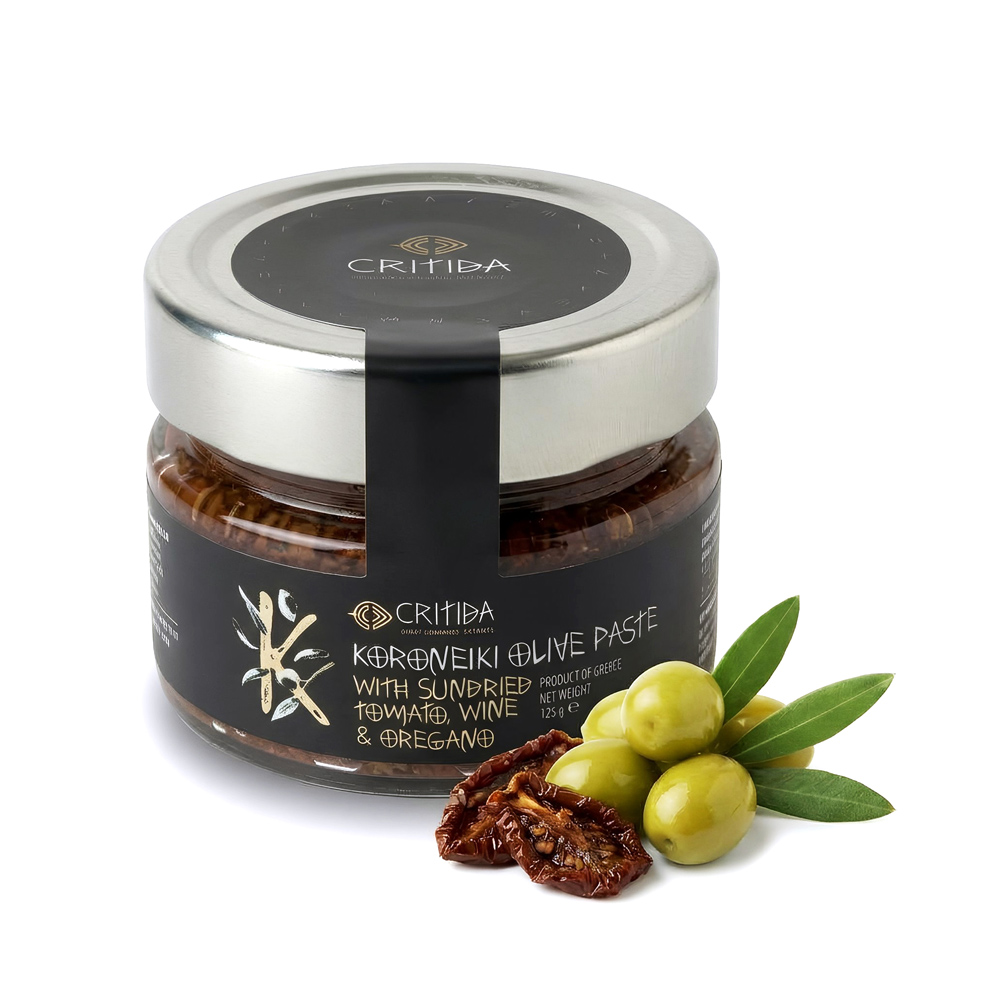 CRITIDA Olivová pasta Koroneiki so sušenými paradajkami, vínom a oreganom prináša kombináciu typických stredomorských chutí. Základ tvorí pasta z olív odrody Koroneiki doplnená o sušené paradajky, víno a oregano.